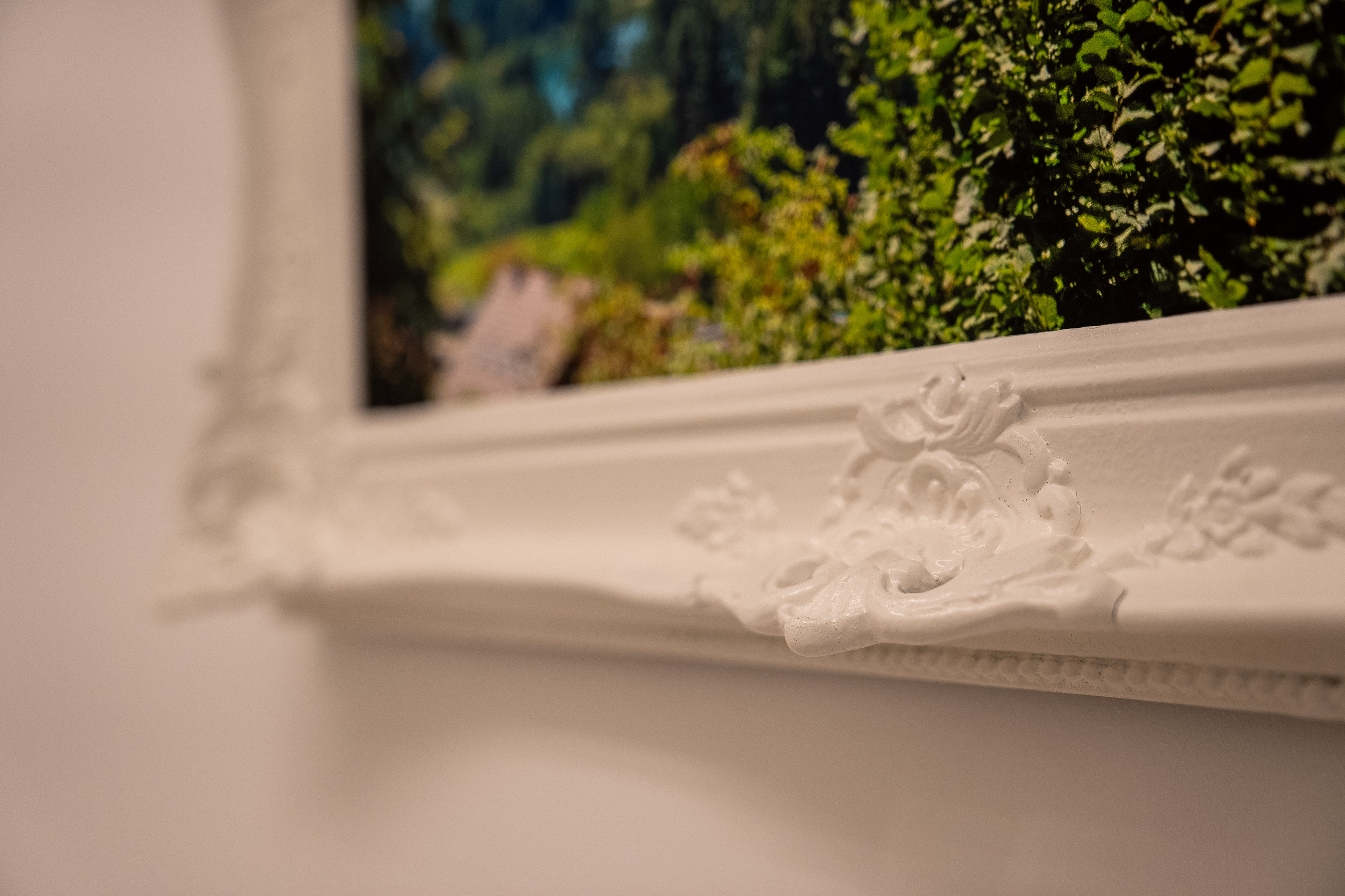 Einem alten Erbstück neues Leben verleihen: Der Kunde wollte diesen geerbten Holzbilderrahmen mit eleganter Verzierung nicht wegschmeißen, aber er passte farblich nicht zu der restlichen Einrichtung. Mit einer neuen Lackierung und dem richtigen Feinschliff strahlt der Rahmen nach vielen Jahrzehnten wieder mit vollem Glanz.